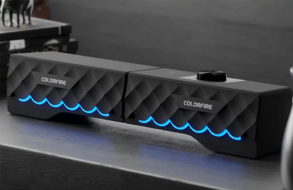 沉浸游戏体验, 无分频式内部电路设计,结合经过Colorfire专业的声学调教的全频扬声器,带来流畅的频段体验,展现震憾的立体环绕音效果体验。